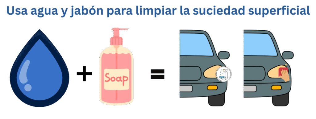 El primer paso y el más sencillo es aplicar agua y jabón en nuestros faros. A pesar de no ser el más efectivo, recuerda que antes de aplicar cualquier otro método que vamos a mencionar a futuro, tenemos que tener nuestros faros previamente limpios. Como es bien sabido, el jabón cuenta con propiedades que rompen la grasa y la suciedad; para casos leves basta solo con realizar una limpieza de los faros para pasar la ITV sin problemas.