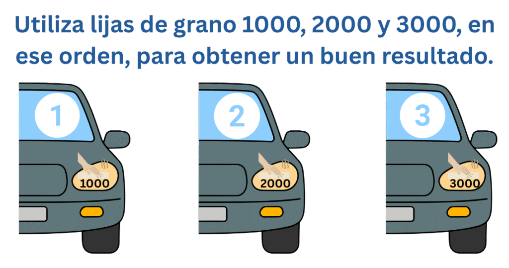 Si no has conseguido un resultado positivo con los métodos mencionados, es hora de usar algo un poco más drástico. Para este caso puedes pulir la superficie del faro para realizar un pulido superficial sin afectar el faro. Para dicho método debes contar con 3 tipos de grano: 1000, 2000 y 3000, que van a realizar distintas funciones. Para comenzar usaremos un lijado grano 1000 para quitar la capa amarillenta dañada, luego usaremos un grano 2000 para reducir rayas que pudieron ser hechas por la 1000 y por último usaremos el 3000 para dejar una superficie uniforme y lisa. Con esto tendrás faros para pasar la ITV sin ningún tipo de problema.