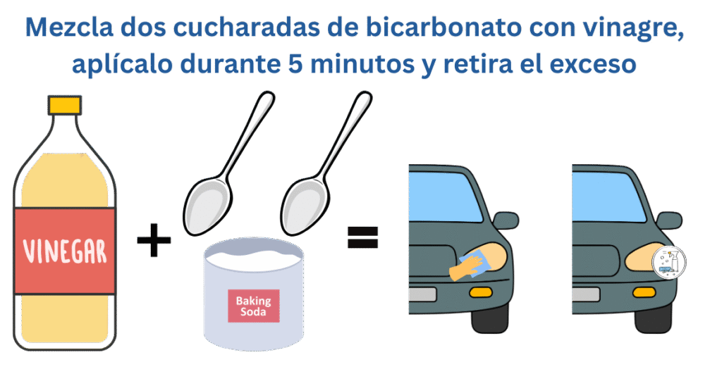 Si has intentado el método anterior y no ha resultado, nos iremos con algo ligeramente más fuerte. La mezcla de bicarbonato con vinagre genera una reacción efervescente que levanta la suciedad incrustada y ayuda a desprender la capa superficial que está desgastada. En relación con las cantidades necesitaremos 2 cucharadas de bicarbonato con un chorro de vinagre, de manera que podamos formar una pasta espesa. Aplica la mezcla sobre los faros limpios y secos y frota suavemente en círculos hasta cubrir la totalidad de los faros. Una vez aplicada la mezcla, deja actuar durante unos 5 minutos, enjuaga con abundante agua y seca con una microfibra.